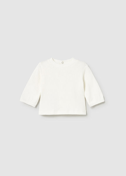 Camiseta de manga larga para recién nacida con puños elásticos. Cierre con botones a presión en la parte posterior. Modelo con rizo.