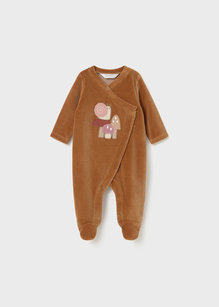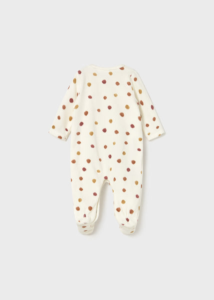 Pijama de manga larga para recién nacida. Cuello redondo. Cierre lateral con botones a presión. Botones a presión en la entrepierna para facilitar la puesta de la prenda. Elementos de adorno: aplique decorativo, bordado.