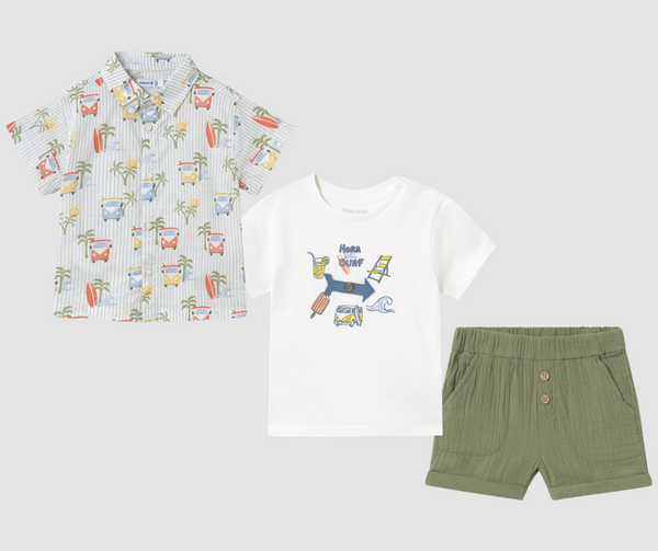Pantalón de tipo bermuda para bebé. Goma elástica regulable con botones en el interior de la cinturilla para mayor ajuste. Tejido de bambula de gran fluidez. Detalle de bajo con vuelta. Bolsillos funcionales en la parte delantera.