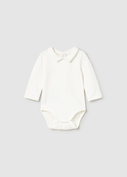 Body de manga larga para recién nacido. Cuello camisero. Cierre con botones a presión en la parte posterior. Botones a presión en la entrepierna para facilitar la puesta de la prenda.