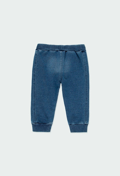 Pantalón de felpa elástica tejanera de niño en color azul, se ajusta con goma y cordón. La decoración es una etiqueta con detalle de la marca. Esta prenda lleva unos desgastados que le dan un aspecto más envejecido.