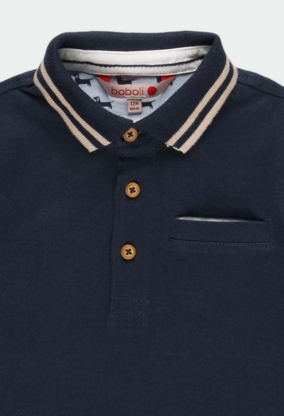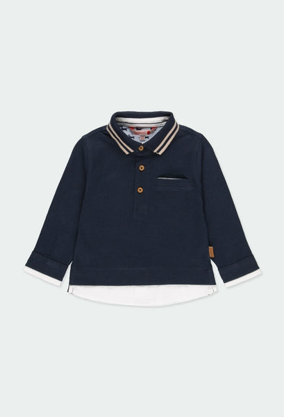 Polo de niño de punto en color azul marino combinado con popelín. Se abrocha con botones en el delantero y puños. Polo efecto doble capa, en los puños y en el bajo lleva piezas de popelín blanco simulando una camisa interior. Lleva coderas de antelina y un pañuelo estampado en el bolsillo del pecho, este pañuelo puede ocultarse dentro del bolsillo.