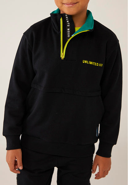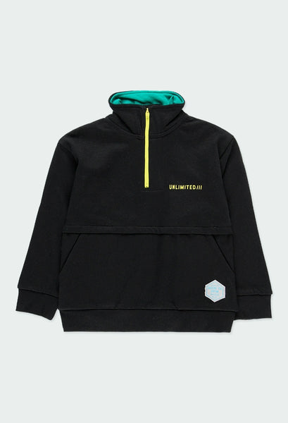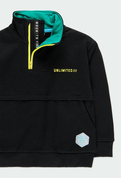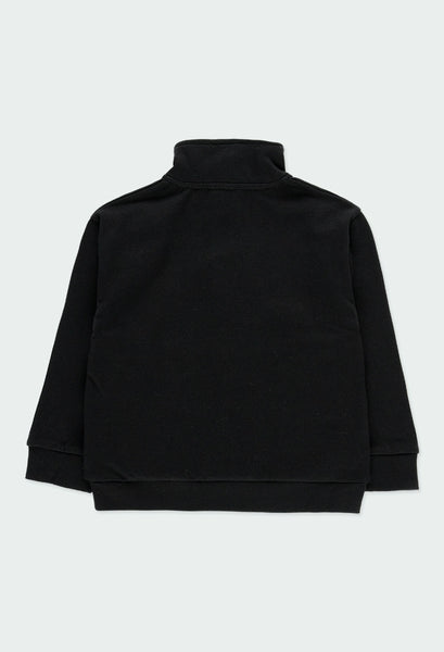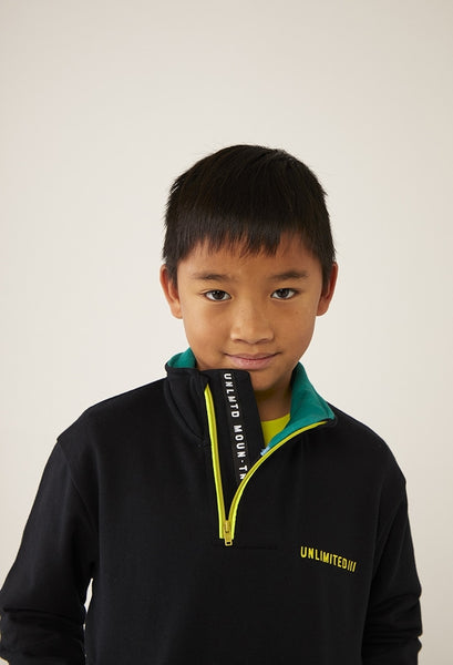 Sudadera de niño en felpa en color negro. Cuello alto en color negro, parte interior en color verde y cremallera a contraste en color pistacho. Pliegue en el centro de la prenda con bolsillos interior. La decoración es un estampado en el pecho y una etiqueta con detalle de la marca.