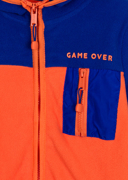 Chaqueta polar en dos colores para niño. Chaqueta con capucha. Con bolsillo en pecho con cremallera vertical. Con estampado engomado en pecho.