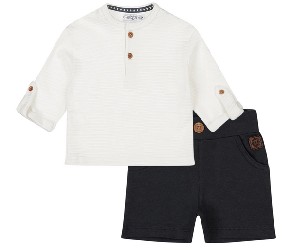 Diversión veraniega óptima con la camiseta de manga larga en blanco. Hecha 100 % algodón, esta camiseta de manga larga es increíblemente ligera y cómoda. Su diseño único con textura de rayas, mangas remangadas y botones en el cuello le da un toque divertido. ¡Una prenda ideal para tu pequeñín!
