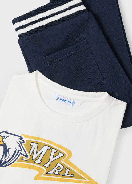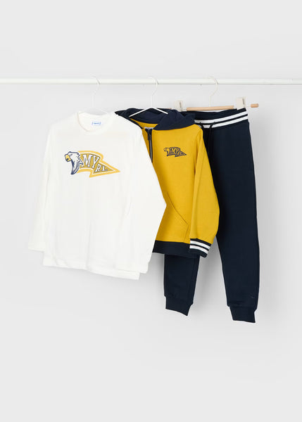 Chándal de tres piezas para niño compuesto por una sudadera, un pantalón largo deportivo y una camiseta a juego. Cálido tejido de felpa gruesa (felpa perchada), perfecta para los meses fríos.
