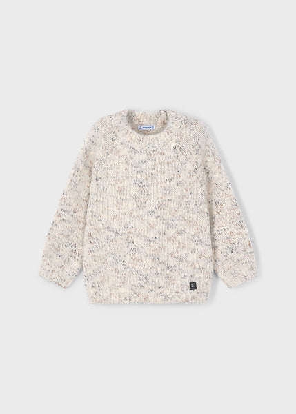 Jersey de manga larga para niño. Cuello redondo. Confección combinada en distintos tejidos para conseguir un diseño único y especial. Efecto jaspeado.
