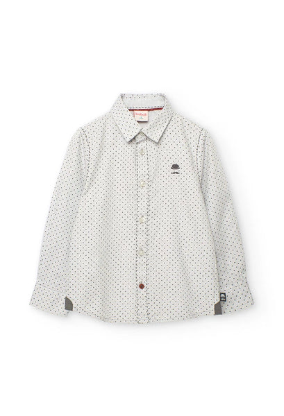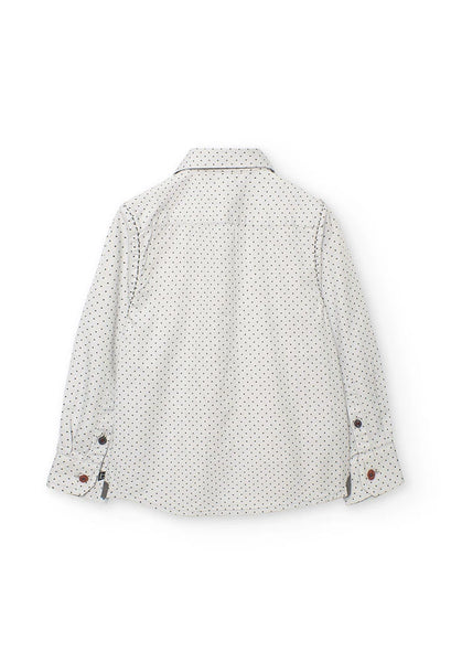 Camisa de oxford para niño, decorada con sofisticados lunares azules sobre un fondo blanco, ideal para ocasiones especiales y eventos formales. El material suave garantiza comodidad durante todo el día, mientras que el diseño clásico, con cuello tradicional y cierre de botones, aporta un estilo elegante. Perfecta para combinar con pantalones oscuros o chinos, creando un conjunto moderno y distinguido para cualquier celebración.