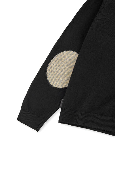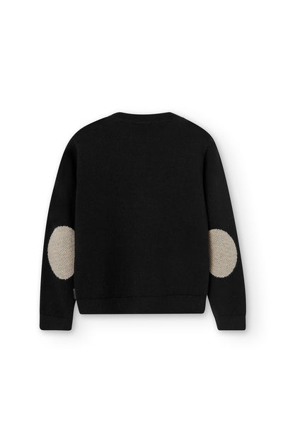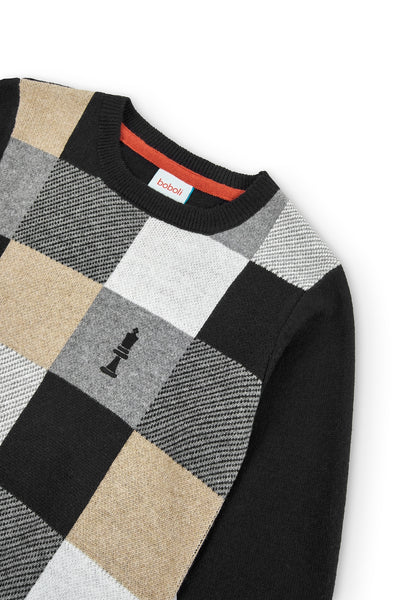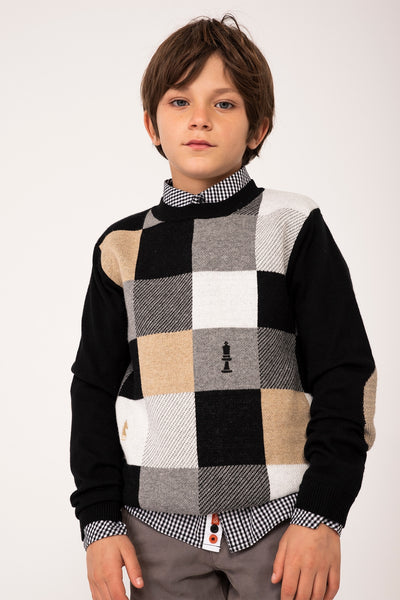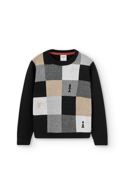 Jersey de niño de tricotosa en color negro, gracias a la intarsia verdadera aparece un diseño de un tablero de ajedrez y piezas en él en color gris vigoré, camel, blanco químico. El cuello es redondo. La decoración es una etiqueta con detalle de la marca. Lleva coderas de tricotosa de color gris vigoré y negro.