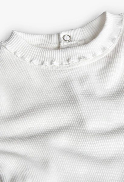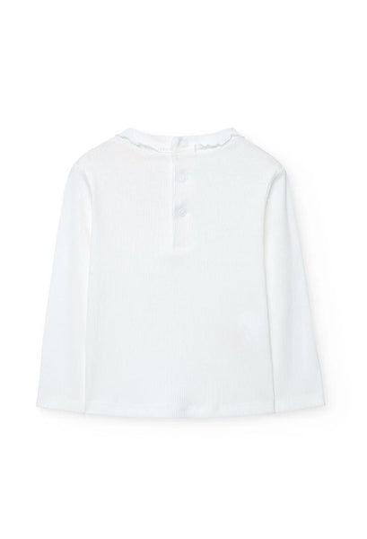 Camiseta de algodón para niña, en color blanco, ideal para los climas más frescos. Diseñada con un elegante cuello redondo adornado con un delicado volante y mangas largas, ofrece comodidad y adaptabilidad. Confeccionada en materiales de alta calidad. Su versatilidad permite combinarla fácilmente con pantalones o faldas, siendo perfecta para ocasiones tanto informales como formales. Una adición esencial al guardarropa de otoño e invierno, esta camiseta garantiza calidez y estilo.