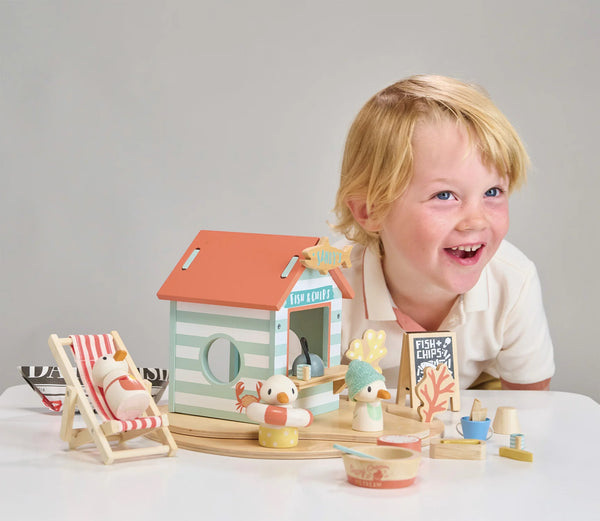 Conoce a Sandy la gaviota y su familia en la playa, donde han ocupado una pequeña caseta de playa y la han convertido en un puesto de pescado y papas fritas, colocada sobre 2 bases de madera que se asemejan a la arena. Han recogido dos trozos de algas marinas, una silla de playa, una tetera, una cubeta de helado de madera con cuchara, tres pescados en un plato, un cubo con papas fritas, un letrero de "pescado y papas fritas", un castillo de arena, un trozo de roca de caramelo y un bote hecho de periódico.