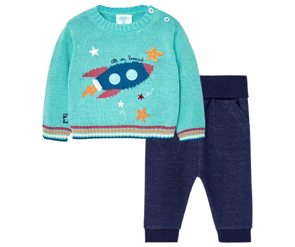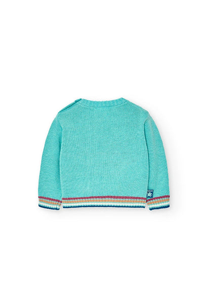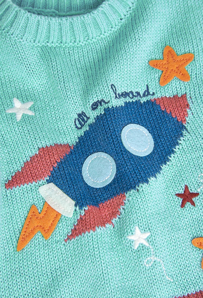 Jersey de bebé niño de tricotosa en color turquesa con una decoración frontal de un cohete y estrellas en aplicaciones bordadas en varios colores. Se abrocha con botones en el hombro. Lleva como decoración una etiqueta con detalle de la marca.