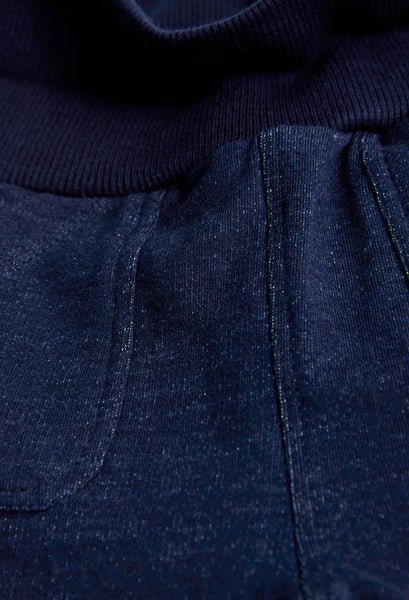 Pantalón de bebé niño de felpa tejanera elástica. Se ajusta a la cintura con una pieza de canalé con gira. La decoración es una etiqueta con detalle de la marca.