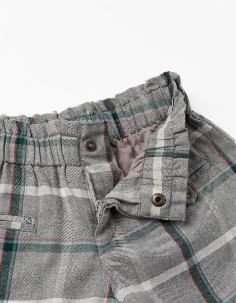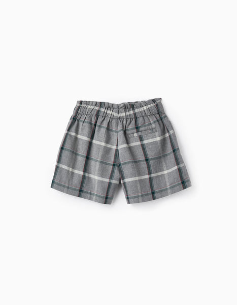 Pantalones cortos grises para niña, en sarga fina para mayor comodidad. Estampado a cuadros en tonos verdes, rojos, blancos y azules. Con forro 100% algodón. Cintura elástica estilo paperbag. Se abrocha en la parte delantera con cremallera y con automático oculto bajo un botón decorativo para vestir fácilmente. Dos bolsillos delanteros con botones y un bolsillo decorativo en la parte trasera. Big Me: se abrocha con automático debajo de un botón decorativo hasta la talla 8/9, para facilitar el vestir y promover la autonomía de su niña.