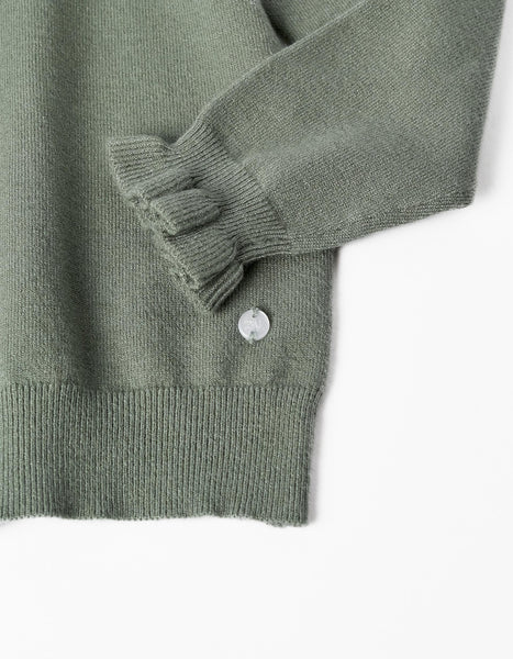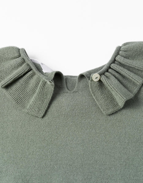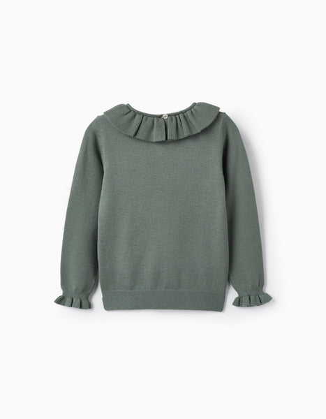 Jersey de punto verde para niña. Volantes en el cuello y en los puños. Puños y base acanalados para un mejor ajuste. Se abrocha en la parte trasera con botón para vestir fácilmente. Un jersey cálido y confortable, ideal para los días más frescos.