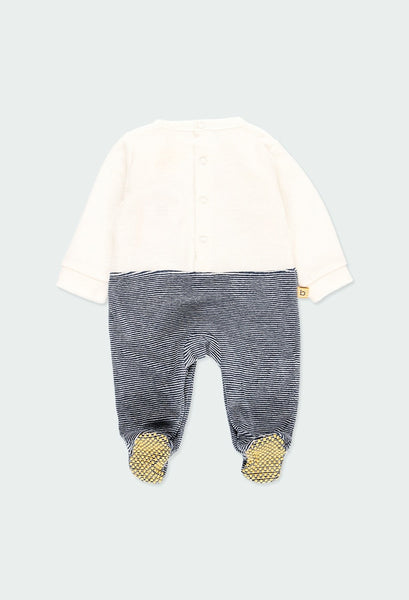 Pelele de bebé niño de terciopelo, se abrocha por la espalda con cierres a presión. La parte de arriba es de color blanco químico y lleva como decoración una cara de gato bordada con orejas y gorro aplicados y detalles estampados y unas patitas aplicadas con detalles bordados y al levantar una lleva una palabra bordada. La parte de abajo es listada en color blanco químico e índigo, la decoración es una etiqueta con detalle de la marca.