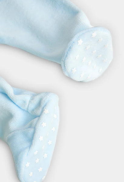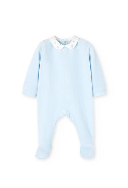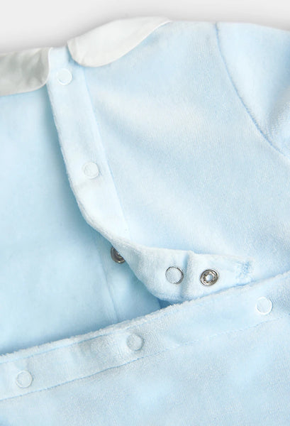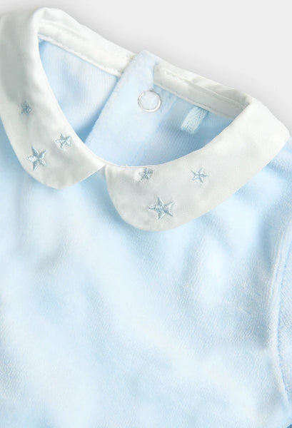 Pelele de terciopelo de bebé niño en color celeste, cuello en tejido liso en color blanco químico con bordado estrellitas en color celeste, se abrocha con cierres a presión.