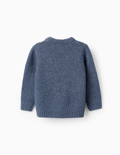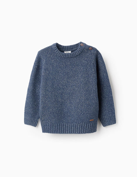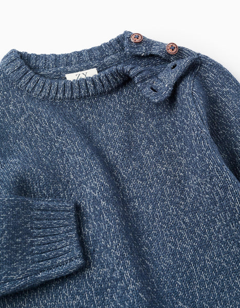 Jersey de punto azul para bebé niño, con mezcla de punto blanco. Extremos acanalados para un ajuste perfecto. Botones marrones en el hombro para vestir fácilmente. Un jersey calentito y elegante, perfecto para cualquier ocasión.