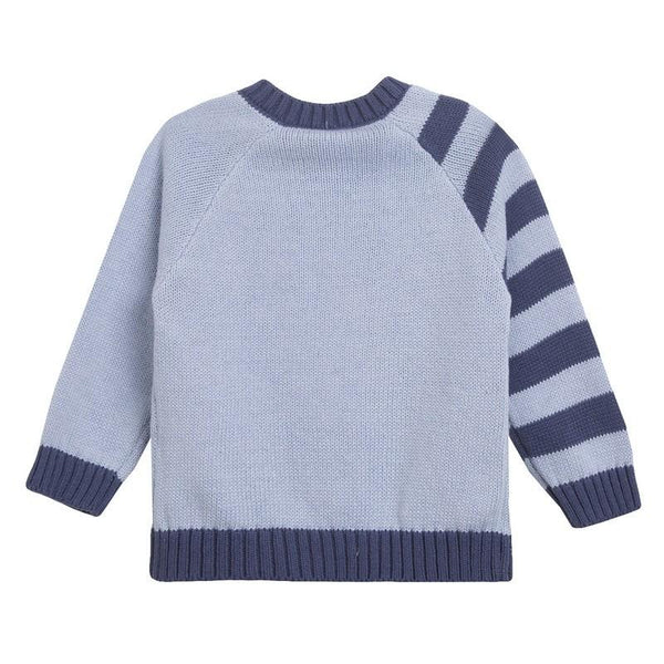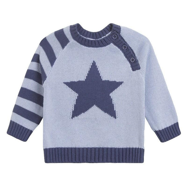 Jersey en punto liso de bebé con estrella en delantero y una de las mangas de rayas, abertura lateral con botones.