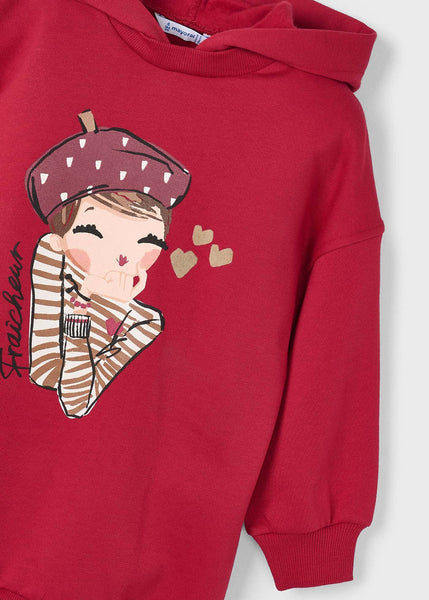 Vestido de manga larga para niña. Cuello con capucha. Cálido tejido de felpa gruesa (felpa perchada), perfecta para los meses fríos. Elementos de adorno: serigrafía (print).