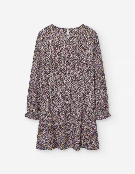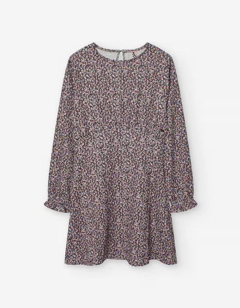 Vestido de niña de manga larga con puños y cintura fruncidas. Cuello redondo y estampado de florecitas.