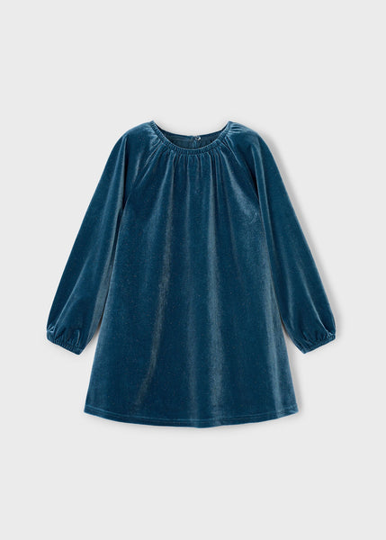 Vestido de manga larga para niña con puños elásticos. Cuello redondo con goma elástica. Cierre con un único botón. Confección en tejido de terciopelo elegante y clásico.