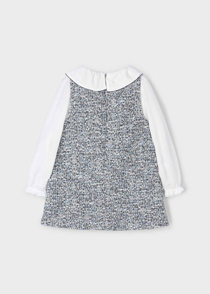 Vestido de manga larga para niña con puños elásticos en el interior. Cuello bebé. Cierre con cremallera en la parte trasera para una puesta ágil y rápida. Confección combinada en distintos tejidos para conseguir un diseño único y especial. Modelo con forro interior. Elementos de adorno: apliques de moños de terciopelo.